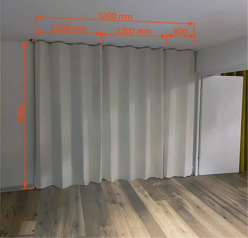 Der Vorhang soll eine von Ihnen beabsichtigte Fläche überdecken – im Bild unten wäre das eine Höhe von 2465 mm und eine Gesamtbreite von 3200 mm. Diese Fläche nennen wir die zu überdeckende Fläche.